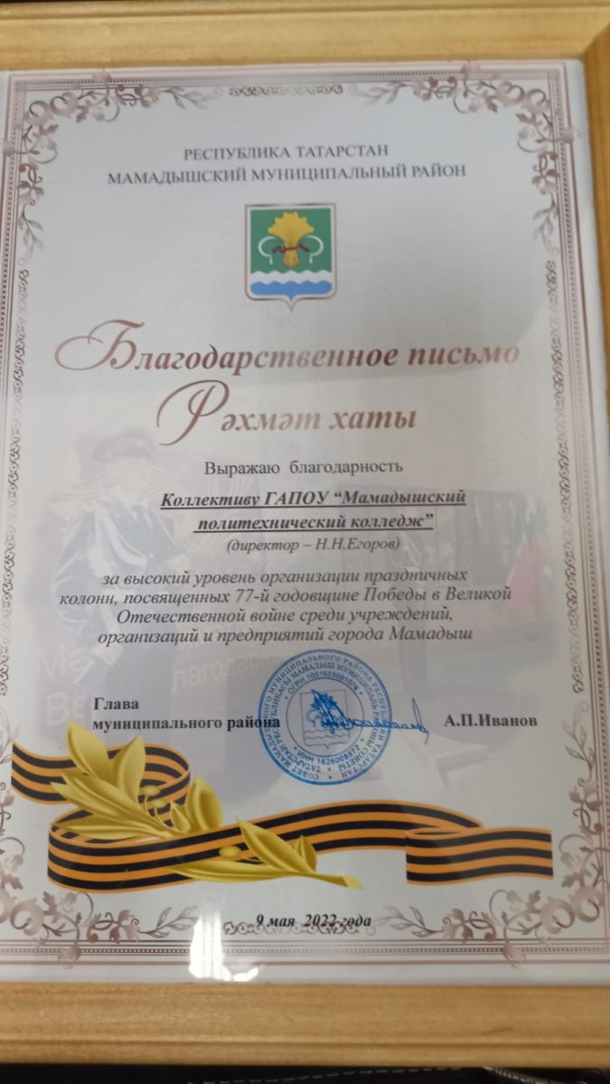Глава муниципального района Иванов А.П. выразил благодрность коллективу ГАПОУ "Мамадышский политехнический колледж" за высокий уровень организации праздничных коллон, посвященных 77-й годовщине Победы в Великой Отечественной войне среди учреждений, организаций и предприятий города Мамадыш. Муниципаль район башлыгы Иванов А.П. "Мамадыш политехник көллияте" ДАҺБУ коллективына, Мамадыш шәһәре учреждениеләре, оешмалары һәм предприятиеләре арасында Бөек Ватан сугышында Җиңүнең 77 еллыгына багышланган бәйрәм коллоннарын югары дәрәҗәдә оештырулары өчен рәхмәт белдерде.