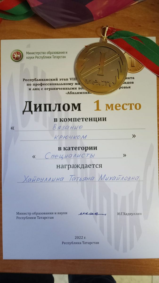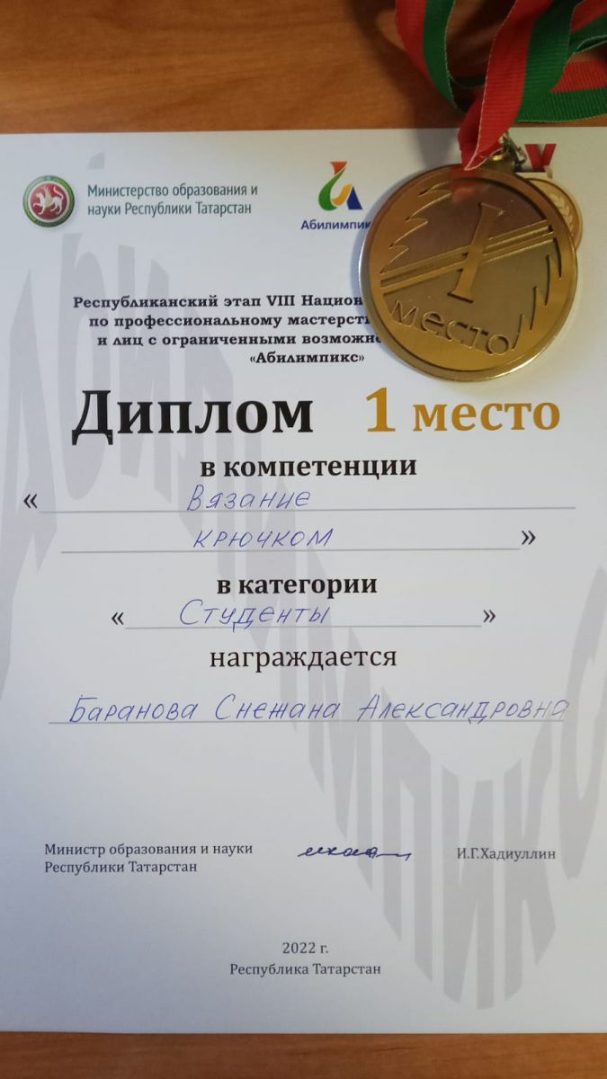 На Республиканском этапе VIII национального чемпионата по профессиональному мастерству для лиц с ограниченными возможностями здоровья «Абилимпикс» в компетенции «Вязание крючком» стали победителями в категории «Специалисты» - Хайруллина Татьяна Михайловна, а в категории «Студенты» - Баранова Снежана Александровна. «Абилимпикс» сәламәтлеге мөмкинлекләре чикләнгән затлар өчен һөнәри осталык буенча VIII милли чемпионатның республика этабында "Бәйләү кармагы белән бәйләү" компетенциясендә «Белгечләр» категориясендә - Хәйруллина Татьяна Михайловна, «Студентлар» категориясендә - Баранова Снежана Александровна җиңүче булды.
