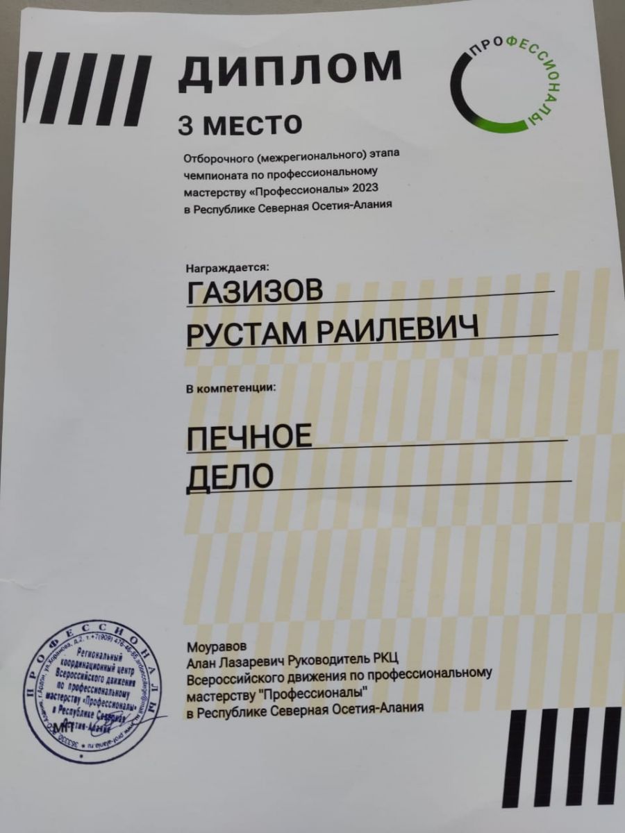 «Профессионалы», где принял участие и наш студент Газизов Рустам. Ему была вручена медаль за 3 место по компетенции "Печное дело", его родителям - благодарность министра образования и науки РТ. Желаем нашим студентам и в дальнейшем завоевывать призовые места в таких престижных конкурсах!!!