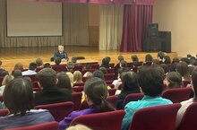 В актовом зале школы прошел «Урок мужества» с участником боевых действий. Боец рассказал обучающимся, что такое солдатский быт, боевое товарищество.