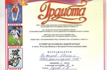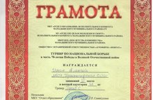 Обучающийся 6 А класса Баженов Евгений участвовал в турнире по национальной борьбе в честь 70-летия Победы в Великой Отечественной войне и занял 1 место в весовой категории 30 кг.