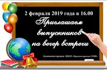 02 февраля 2019 года в 16.00 ч. в школе состоится Вечер встречи выпускников. Программа вечера: 16.00 ч.-приветствие гостей, концерт;