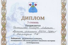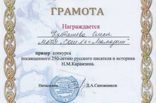 Левонян Арпине, Исмагилова Динара под руководством учителя русского языка и литературы Черновой Г.В. приняли участие в конкурсе, посвященном 250-летию русского писателя и историка Н.М. Карамзина, и были награждены Дипломом 3 степени. Желаем вам дальнейших побед!