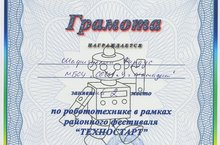 На базе МБОУ "Лицей №2 г. Мамадыш" проходили районные соревнования "Техностарт-2015", по судомоделированию Пинегин Владимир, 5б класс, был удостоен сертификата за активное участие, по робототехнике в номинации "Движение по линии" Шафигуллин Фирдус, 4а класс, занял 2 место, в номинации "Сумо" Муллахметов Булат, 5а класс, был удостоен сертификата за активное участие(руководитель Ханафеев И.М.). Мы их поздравляем и желаем дальнейших побед!