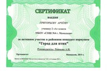 Сертификат МКУ "Отдел образования", МБОУ ДОД "Дом детства и юношества" за активное участие в районном конкурсе-выставке кормушек "Город для птиц" выдан Григорьеву Артёму, ученику 2а класса (Раимова Г.Н.), Захаровой Анисии, ученице 1б класса (рукводитель Воронцова Л.В.). Поздравляем и желаем дальнейших побед!
