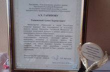 Министерство образования и науки Республики Татарстан выражает благодарность Гарипову А.Х. за подготовку лауреата премии Президента Российской Федерации по поддержке талантливой молодежи в рамках приоритетного национального проекта "Образование". Алмазу Хурматовичу была вручена Благодарность МО и Н РТ и кубок. Мы его поздравляем и желаем дальнейших побед!