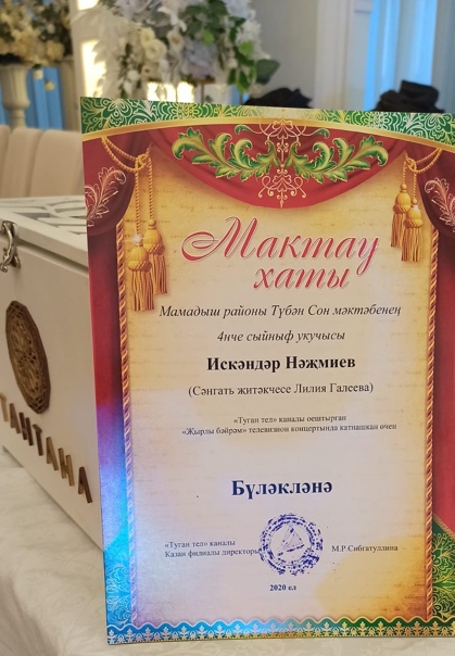 10 декабря Назмиев Искандер, воспитанник вокального объединения «Квантики» педагог Галеева Л.Н принял участие в съемках новогодней программе «Жырлы бэйрэм» на канале «Туган тел» где исполнил песню «Тэгэрмэчлэр».