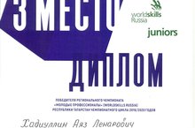 С 11 по 16 ноября 2019 г. в г.Набережные Челны прошел Республиканский этап соревнований Worldskills Russia Juniors по компетенции «Лазерные технологии». Учащийся МБОУ «Лицей 2 им.ак. К.А. Валиева г. Мамадыш», занимающийся в МБОУ ДО «Дом детства и юношества», Хадиуллин Аяз (7 класс) занял 3 место (руководитель Гурьев Р.Г.) Поздравляем воспитанника и желаем дальнейших успехов!!!!!!