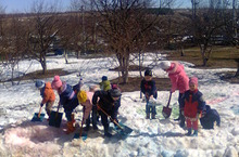 Балалар бакчасында язгы өмә оештырылды. Һәр бала кызыксынып тирә-якны чистартып, тәртипкә китерү өстендә эшләде бу көнне. Безнең балалар бакчасы шау-гөр килеп торды. Кардан арчылып бетмәгән урыннарда кар тараттык, кипкән җирләрне тырмалам, себереп чүпләрдән арындырдык.