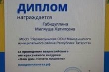 Учитель химии и биологии Габидуллина Миляуша Хатиповна за проведение всероссийского интерактивного экоурока "Наш дом. Ничего лишнего" была награждена дипломом.