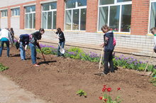Мәктәп яны тәҗрибә участогында укучылар чәчәкләр утырту өчен җир казыдылар, тырмаладылар, түтәлләр ясадылар.