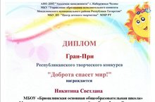 30 декабря стало известно, что ученица 4 класса МБОУ "Брюшлинская ООШ" Никитина Светлана стала обладательницей Диплома Гран-При Республиканского творческого конкурса "Доброта спасет мир!", с чем мы поздравляем и Светлану и куратора данного проекта Тимошенко В. М. и желаем им дальнейших творческих успехов!