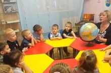 Тема занятия: "Земля - наш дом". Дети ознакомились с макетами нашей планеты Земля, увидели внутреннее строение планеты.