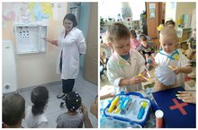 Дети группы «Сказка» познакомились с профессией врача . Вместе с воспитателем ребята пришли на экскурсию в медицинский кабинет.