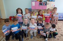 В группе «Пчёлка» традиционно накануне празднования Дня России прошло мероприятие. Утро воспитанники встретили зарядкой под музыку и слова В. Осошника «Мы дети твои, Россия!». Была проведена беседа на тему: «Наша Родина – Россия», в ходе которой воспитанники познакомились с понятиями «Родина», «флаг», «герб», «гимн». Затем дети внимательно рассмотрели российский флаг и выполнили свой рисунок «Российский флаг»