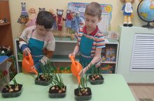 В логопедической группе «Радуга» дошкольники опрыскивают растения из пульверизатора, сметают щеточкой пыль с ворсистых листьев, рыхлят землю. С помощью воспитателя дети подкармливают растения, поливают рассаду и цветы.