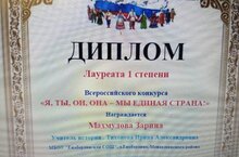 Поздравляем с победой! 25.11.2025 Поздравляем с победой! Махмудову Зарину . Зарина стала лауреатом первой степени во Всероссийском конкурсе «Я, ТЫ, ОН, ОНА – МЫ ЕДИНАЯ СТРАНА!». Ее работа «Традиции на Руси: источник добра и красоты» заняла первое место в номинации «Традиций на Руси так много добрых и прекрасных...». Организаторами конкурса выступили Управление образования Исполнительного комитета ММР РТ, МАУ «Дворец культуры им. С.Гассара» г. Менделеевск РТ и Приемный центр развития «СУПЕР ПОКОЛЕНИЕ» Менделеевск. Благодарим за наставничество учителя истрии и обществознания нашей школы Тихонову Ирину Александровну !!!