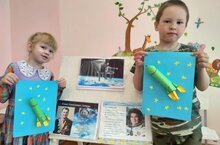 В дошкольной группе идёт неделя, посвящённая Дню космонавтики. Сегодня воспитатель провела познавательную беседу с целью формирования элементарных представлений о космосе, о первом космонавте Юрие Гагарине. Дети самостоятельно проявляли инициативу, рассматривали иллюстрации, задавали вопросы. А свое творчество проявили при изготовлении из бумаги космического корабля.