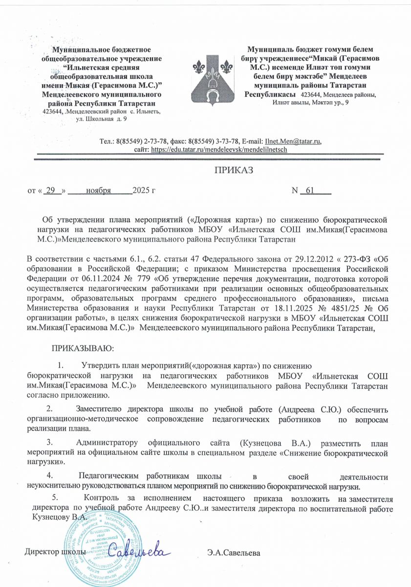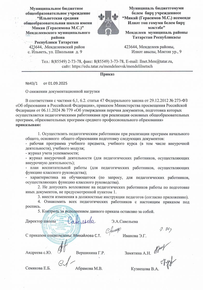 муниципальное бюджетное общеобразовательное учреждение "Ильнетская средняя общеобразовательная школа имени Микая (Герасимова М.С.)" Менделеевского муниципального района Республики Татарстан