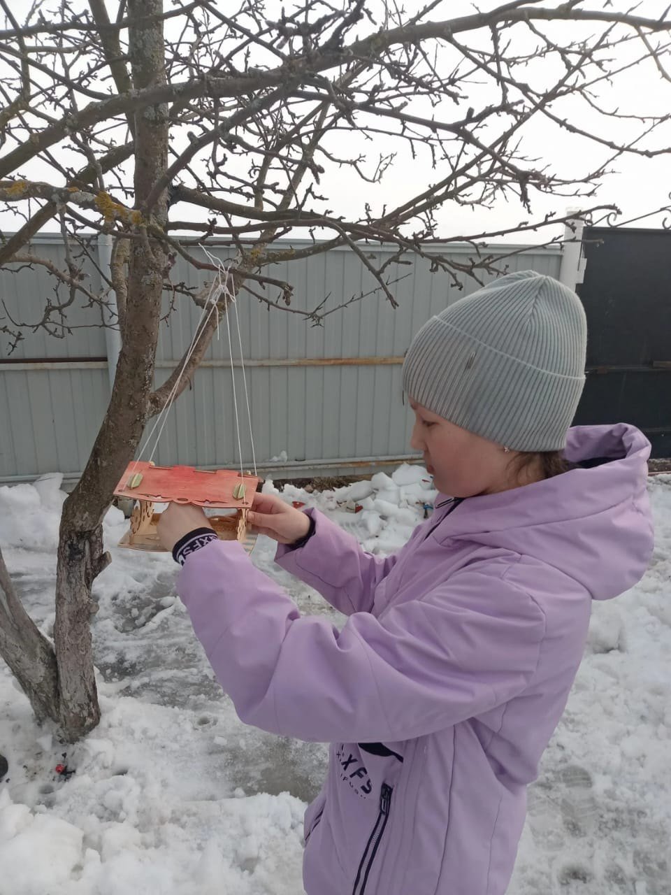 В рамках первой недели "Помоги Пернатым" ученица развесила на деревьях сделанные вчера кормушки и положила еду для птиц.