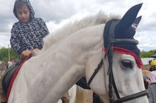 Сначала ребята посетили Конный двор, где они покатались на лошадях и покормили их морковкой и сахаром.