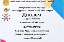 В Муниципальном бюджетном общеобразовательном учреждении «Гимназия №175» Советского района г. Казани прошел I Республиканский конкурс литературного творчества «Грани добра» для обучающихся 1-11 классов образовательных организаций Республики Татарстан. Конкурс направлен на популяризацию среди обучающихся татарской, русской литературы, повышение интереса к чтению и творчеству, развитие культуры публичного выступления, выявление литературно одаренных обучающихся. Ученица 9 класса «Б» нашей школы приняла в нем участие и завоевала Диплом Лауреата 3 степени!