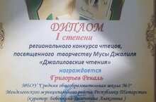 16.02.2023 3 нче мәктәп укучысы Григорьев Реналь укытучы Бобовкина Валентина Алексеевна җитәкчелегендә Муса Җәлил иҗатына багышланган «Җәлил укулары» төбәк укучылар конкурсында катнашты . 1 дәрәҗә диплом белән бүләкләнә. Реналга алга таба уңышлар телибез!
