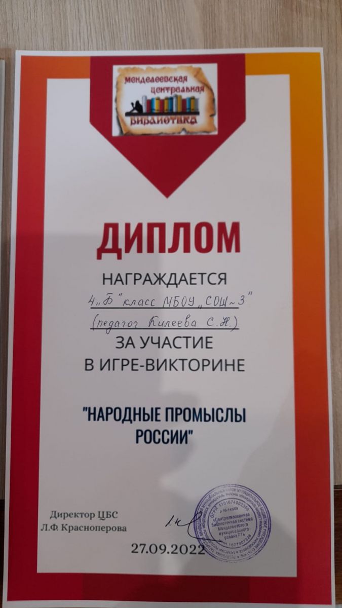Үзәк китапханә 3 нче мәктәпнең 4Б сыйныф укучылары өчен "Россиянең халык кәсепләре"уен-викторинасы үткәрде. 4 нче сыйныф укучылары командасы китапханә хезмәткәрләре командасы белән көч сынашты. Безнең укучыларыбыз җиңү яулады һәм бүләккә "Барысы турында да"энциклопедия алды.