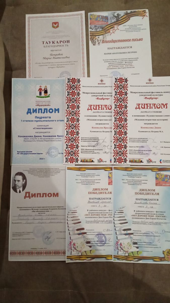 Безнең мәктәп укучылары Коновалова Диана (4А) һәм Коновалов Ярослав (1А) 3 атна эчендә "Мудорвай" (Енабердино), "Мудорвай" гала - концерты (им.Гассара), "Карлыхор", " безне исем берләштерде..."(Монашево авылы) һәм район патриотик җыр һәм шигырьләр фестивале "Cиннән дә кадерлерәк юк, Россия!" бөтен җирдә дә I дәрәҗә җиңүчеләр һәм лауреатлар булдылар!