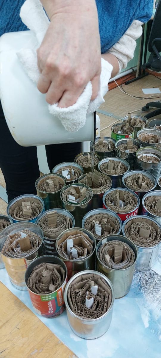 Опубликовано: 23.01.2023Учащиеся 7а и 6в под руководством учителя технологии Крестьяниновой Н.П. готовят окопные свечи для СВО