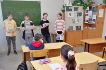 День космонавтики для учащихся 5б и 9а класса, ученики 5 класса подготовили сообщения :"Первые живые существа в космосе", "биография Гагарина", "Первая женщина-космонавт", "планеты Солнечной системы" "Первые полёты над Землей". Дети ответили на вопросы викторины по данной теме