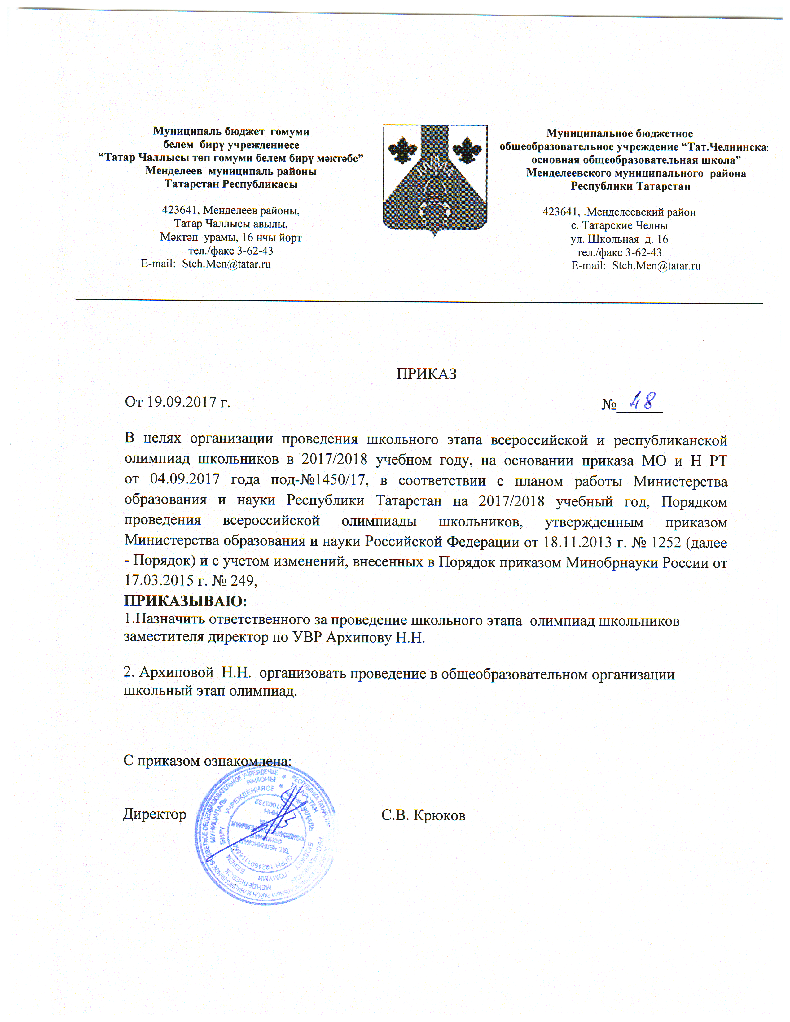 Приказ о проведении школьного этапа Всероссийской олимпиады школьников