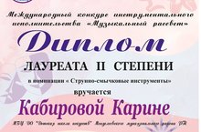 И вновь очередная победа воспитанницы ДШИ. Учащаяся Детской школы искусств Кабирова Карина приняла участие в Международном конкурсе инструментального исполнительства «Музыкальный рассвет», где стала Лауреатом II степени....