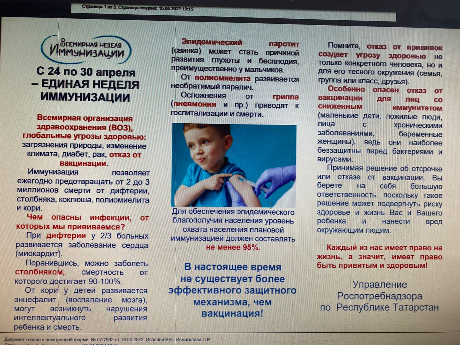 В Неделю иммунизации мы вспоминаем о том, что благодаря массовой вакцинации населения на нашей планете были ликвидированы многие эпидемиологические заболевания, уносившие в прежние времена тысячи человеческих жизней.Сейчас на очереди стоит ликвидация кори, полиомиелита, эпидемического паротита. Разработаны вакцины против ветряной оспы, папилломы, дизентерии , пневмонии и других распространенных заболеваний.Иммунизация спасает миллионы жизней и признается большинством специалистов одной из наиболее эффективных мер вмешательства. Тем не менее ситуация в этой области далека от идеальной.Ежегодно в мире от инфекционных заболеваний умирает свыше 15 миллионов человек. Причинами этого являются недостаточный уровень финансирования, недостаточное поступление медицинских препаратов, отсутствие доступа к пациентам службам здравоохранения и др.Вместе с тем многие жизни можно было бы спасти благодаря своевременно проведенным прививкам.Всемирная неделя иммунизации достаточно широко отмечается в нашей стране. В России перечень инфекционных заболеваний, прививки от которых являются обязательными и бесплатными для всех граждан, и порядок проведения профилактических прививок определен федеральным законом № 157-ФЗ от 17.09.98 года «Об иммунопрофилактике инфекционных болезней».Национальный календарь профилактических прививок включает вакцинацию против 14 инфекций: