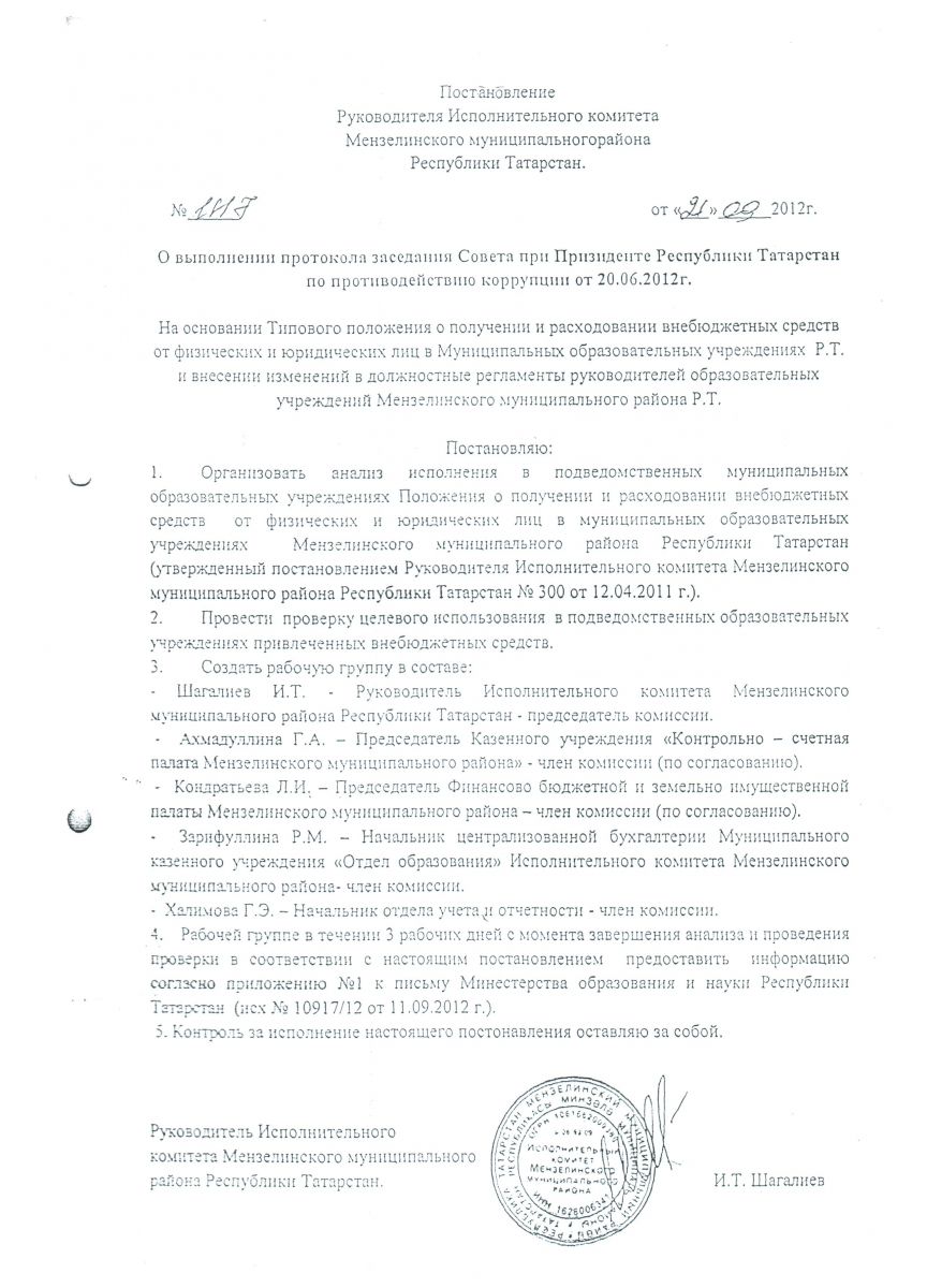 Постановление Руководителя исполнительного комитета Мензелинского муниципального района РТ от 12 апреля 2012 года № 300 >>>