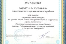 Колектив нашего детского сада занял первое место в муниципальном конкурсе на лучший макет зданий или архитектурных сооружений города Мензелинска "Мензелинск- наши истоки, наше будущее" в рамках Года национальных ь культур и традиций в Республике Татарстан"