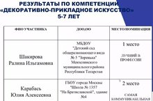 Воспитанница детского сада 5 "Зоренька" стала победителем всероссийского уровня чемпионата рабочих профессий «BabySkills» в компетенции "Декоративно прикладное искусство". Чтобы стать обладателем заветной медали, Шакирова Ралина (наставник Закирова В.О.) занимала первые места на районном и республиканском этапах. На чемпионатных площадках соревновались 206 участников из разных уголков Российской Федерации. 140 дошкольников. 66 младших школьников по 21 компетенции. Главным экспертом Чемпионата отмечен высокий уровень подготовки участника и умение Ралины демонстрировать лучшие качества, присущие данной профессии. Она действительно достнойно представила Республику Татарстан на данном Чемпионате.