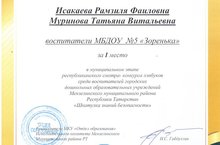 Наши воспитатели Муринова Т.В. и Исакаева Р.Ф. заняли ПЕРВОЕ МЕСТО в муниципальном этапе республиканского смотра-конкурса лэпбуков среди воспитателей городских дошкольных образовательных учреждений Мензелинского муниципального района Республики Татарстан "Шкатулка знаний безопасности". Районный этап смотр-конкурса лэпбуков среди воспитателей дошкольных образовательных организаций Мензелинского муниципального района РТ по обучению дошкольников навыкам безопасного поведения на дорогах «Шкатулка знаний безопасности» проводился на основании республиканского конкурса и в рамках реализации подпрограммы «Повышение безопасности дорожного движения в Республике Татарстан на 2014-2020 годы» государственной программы «Обеспечение общественного порядка и противодействие преступности в Республике Татарстан на 2014-2020 годы»
