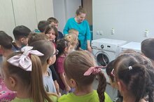 Хезмәтне саклау айлыгы барышында әзерлек төркемендә тәрбияләнүчеләр балалар бакчасының кер юу бүлмәсендә булдылар. Электр приборлары:кер юу машинасы һәм үтүк куркыныч предметлар булып тора, аларны дөрес файдаланмасаң һәм су белән үзара тәэсир итешсәң, бәхетсезлек очрагы килеп чыгарга мөмкин. Аны булдырмас өчен ,кер юу бүлмәсе хезмәткәре алар белән эшләгәндә ТБ сакларга тиеш:приборларны энергиядән өзәргә, әгәр алар кулланылмаса, куллар һәрвакыт коры булырга тиеш. Бинаны чиста тотарга.