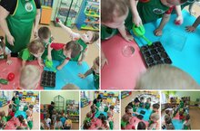 Юные агрономы с удовольствием и интересом осматривали семена и трогали землю, насыпали ее в формочки, разложили семена, присыпали землей и полили.