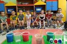 Суть эксперимента: Бумага отлично впитывает воду. Полотенца постепенно промокают, и окрашенная жидкость «путешествует» в пустой стакан. Он заполняется до одного уровня с прочими двумя, и вода внутри от смешения цветов приобретает совершенно новый оттенок.«Йөгереп йөрүче су»2 кече һәм урта группасында тәҗрибә Экспериментның барышы: 1) ике төсне алабыз да су белән кушабыз һәм табылган эремәләр белән 2 стакан тутырабыз; 2) кәгазь сөлгеләрне буйга бөклибез һәм тутырылган стаканнарның һәркайсына (берәр) куябыз; 3) сөлгеләрнең капма-каршы очларын буш стаканга төшерәбез. Күзәтү. Бу тәҗрибәне үткәрү өчен беркадәр вакыт кирәк булачак. Экспериментның асылы: кәгазь суны бик яхшы сеңдерә. Сөлгеләр акрынлап чылана, һәм буялган сыеклык буш стаканга «сәяхәт итә". Ул башка икесе белән бер дәрәҗәгә кадәр Тула, һәм эчендәге су төсләр кушылудан бөтенләй яңа төс ала.