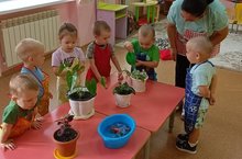 В процессе ухода за растениями воспитанники 1 младшей группы «Гномики» узнали, что для роста цветов нужны земля, вода и воздух, а также научились правильно держать лейки, поливать растения и протирать крупные листочки влажной тряпочкой.Такие элементарные трудовые поручения воспитывают интерес к комнатным растениям и желание ухаживать за ними.Балалар бакчасындагы бүлмә үсемлекләре интерьер предметы гына түгел, ә һаваны чистарту чарасы, балаларны табигать белән таныштыру һәм аралашу чарасы да.Үсемлекләрне карау барышында «гномика» ның 1 нче төркем тәрбияләнүчеләре чәчәкләр үсү өчен җир, су һәм һава кирәклеген беләләр, шулай ук лейкаларны дөрес тотарга, үсемлекләрне сугарырга һәм эре яфракларны дымлы тукыма белән сөртергә өйрәнәләр.Мондый гади хезмәт йөкләмәләре бүлмә үсемлекләре белән кызыксыну һәм аларны карарга теләк тәрбияли.