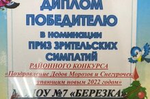 Наш МБДОУ 7 « Берёзка» приняли активное участия в районом конкурсе, поздравления Деда Мороза и Снегурочки с наступающим новым 2022 годом и был награждён Дипломом Победителя в номинации Приз зрительских симпатий