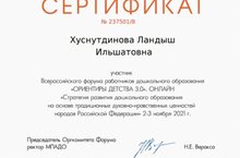 Воспитатель МБДОУ номер 7 "БЕРЁЗКА" Хуснутдинова Ландыш Ильшатовна стала участником Всероссийского форума работников дошкольного образования "ОРИЕНТИРЫ ДЕТСТВА 3.0" Онлайн."Стратегия развития дошкольного образования на основе традиционных духовно-нравственных ценностей народов Российской Федерации",проходившего 2-3 ноября 2021 года.