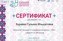 «Каенкай» балалар бакчасының мәктәпкә әзерлек төркеме тәрбиячесе Буреева г.и. "зур энтографик диктант-2021" акциясендә катнашты һәм сертификат алды. Чара Халыклар бердәмлеге көненә багышланган