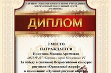 Воспитанница средней группы Никитина Милана приняла участие во Всероссийском конкурсе рисунков "Оранжевый жираф" и награждена дипломом 2 степени в номинации " Лучший рисунок жирафа". Руководитель: Хуснутдинова Л.ИНикитина Милана "Оранжевый жираф" Бөтенроссия рәсем конкурсында катнашты һәм "иң яхшы жираф рәсеме"номинациясендә 2 дәрәҗә диплом белән бүләкләнде. Җитәкчесе: Хөснетдинова Л. И -