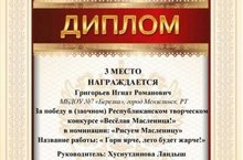 Воспитанник МБДОУ номер 7 "БЕРЕЗКА" Григорьев Игнат принял участие в Республиканском конкурсе рисунков "Веселая Масленица!" и награждён дипломом 3 степени за победу в номинации "Рисуем Масленицу". Руководитель: Хуснутдинова Л.И7 нче "Каенкай" балалар бакчасында тәрбияләнүче Григорьев Игнат "күңелле Масленица! ул "Масленицаны ясыйбыз"номинациясендә җиңгән өчен 3 дәрәҗә диплом белән бүләкләнде. Җитәкчесе: Хөснетдинова Л. И