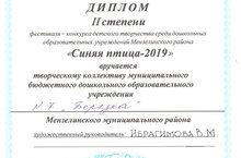 2019 елның 22 ноябрендә безнең балалар бакчасында тәрбияләнүчеләр Минзәлә районының мәктәпкәчә белем бирү учреждениеләре арасында үткәрелгән «Зәңгәр кош - 2019 » фестиваль-конкурсында катнаштылар. Балалар «Тату балалар»биюендә үзләренең сәләтләрен күрсәтә алдылар.