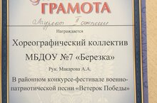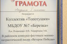 Детский коллектив «Топотушки», были награждены почётной грамотой, получили звание «Лауреата I степени».