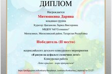 Воспитанница младшей группы, Митюшкина Дарина, приняла участие во всероссийском конкурсе рисунков на асфальте и заняла 2 место.